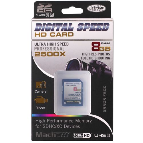 Capture Full HD, 3D, and 4K content with the Digital Speed 2500X 8GB Professional High Speed Mach III 350MB/s Error Free (SDHC) HD Memory Card Class 10 Memory Card. Each of the included SDXC memory card meets the UHS Speed Class 10 specification with maximum data speed of 350 MB/s. While this card is designed to meet the needs of those requiring enhanced data transfer rates, it remains backwards compatible with devices requiring UHS-II, Class 10 memory cards.