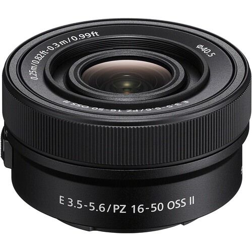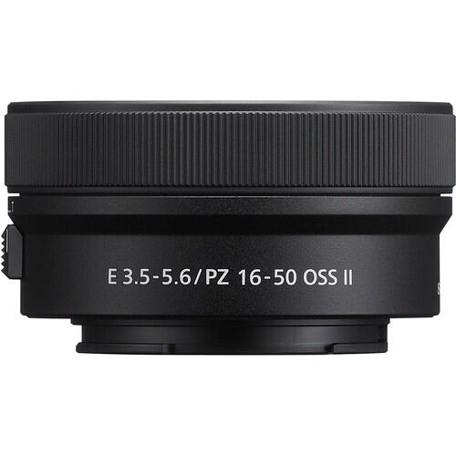Designed for APS-C mirrorless camera sensors, the black E PZ 16-50mm f/3.5-5.6 OSS II Lens from Sony offers a versatile full-frame equivalent zoom angle of 24-75mm within a compact design. A variable aperture of f/3.5 to 5.6 helps keep the lens's size and weight to a minimum while accommodating most use cases. When the camera is powered off, the lens retracts to just 1.25".